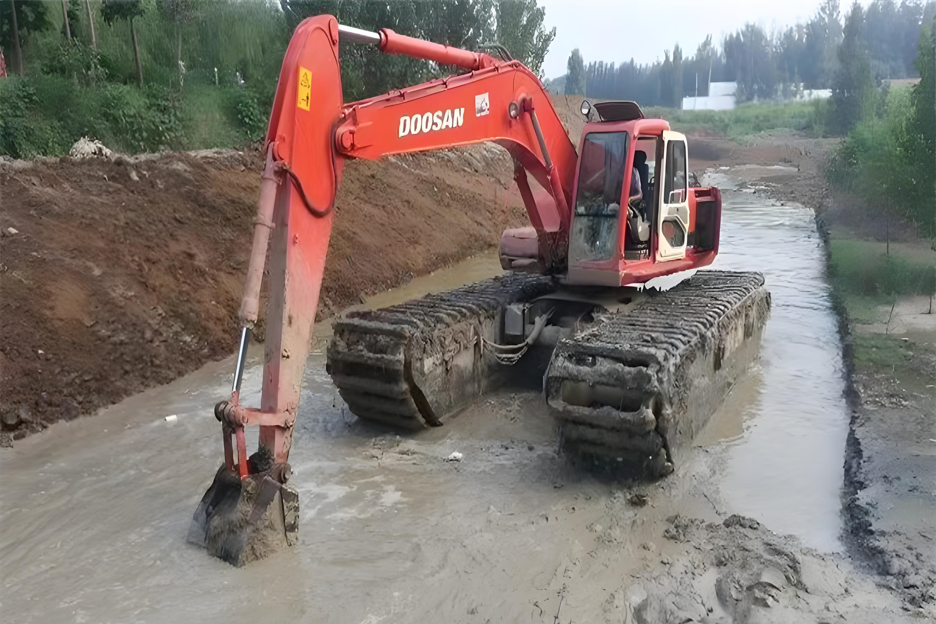 首先是水流速度的影響。汛期雨水集中,河道水位上漲的同時(shí),水流速度可能從平時(shí)的 1-2 米 / 秒飆升到 3-5 米 / 秒,就像挖機(jī)在 “激流中作業(yè)”。水上挖機(jī)雖然有浮箱支撐,但高速水流會(huì)持續(xù)沖擊機(jī)身,導(dǎo)致挖機(jī)定位困難,甚至出現(xiàn)輕微漂移。這時(shí)候別說精準(zhǔn)清理河底淤泥了,就連挖斗下鏟的角度都難控制,很容易出現(xiàn) “挖空” 或 “漏挖” 的情況,清淤效率會(huì)大打折扣。
